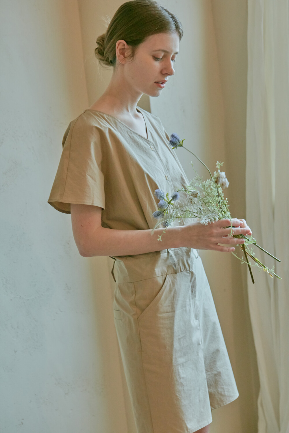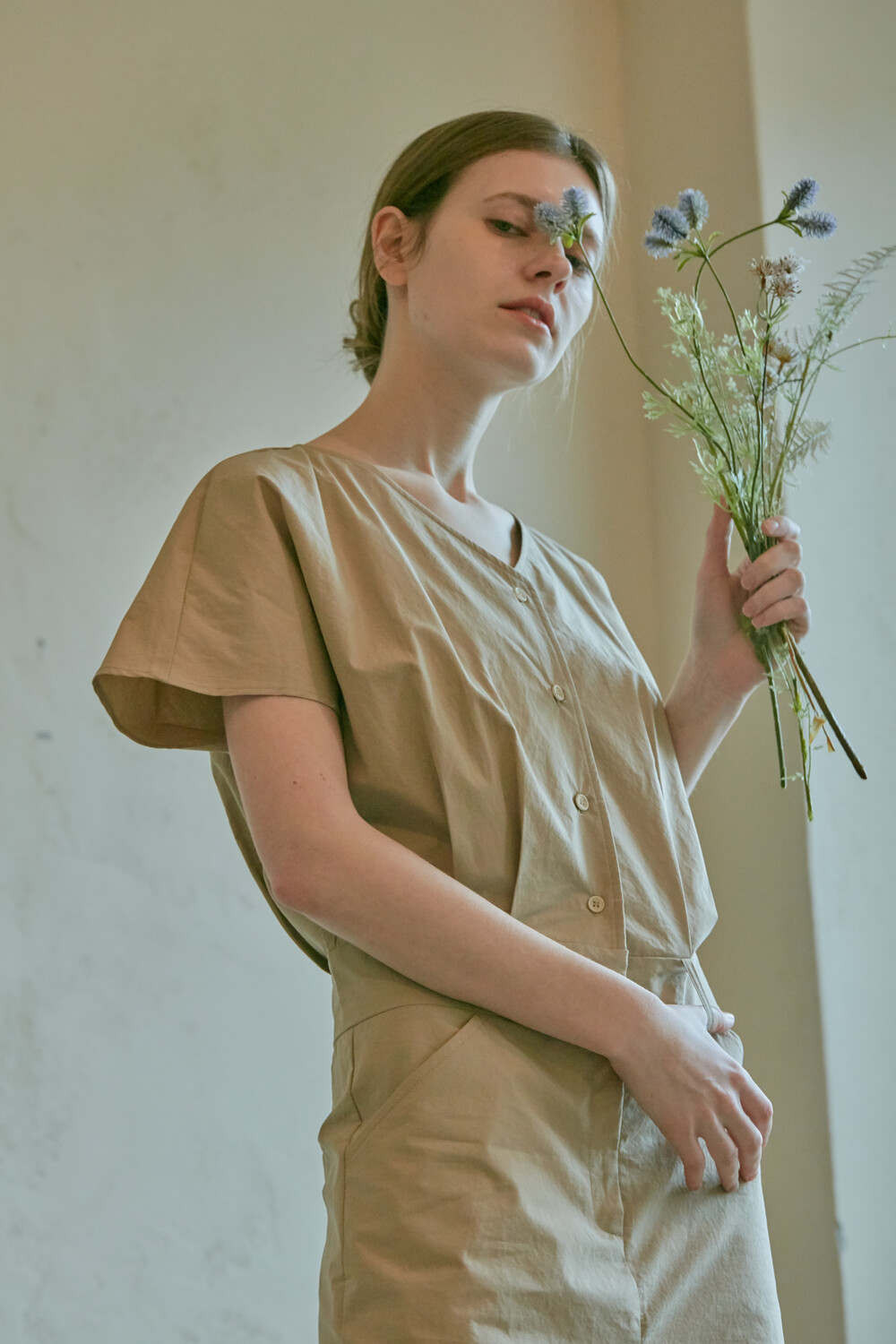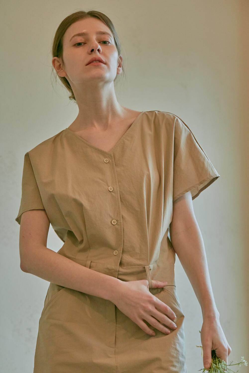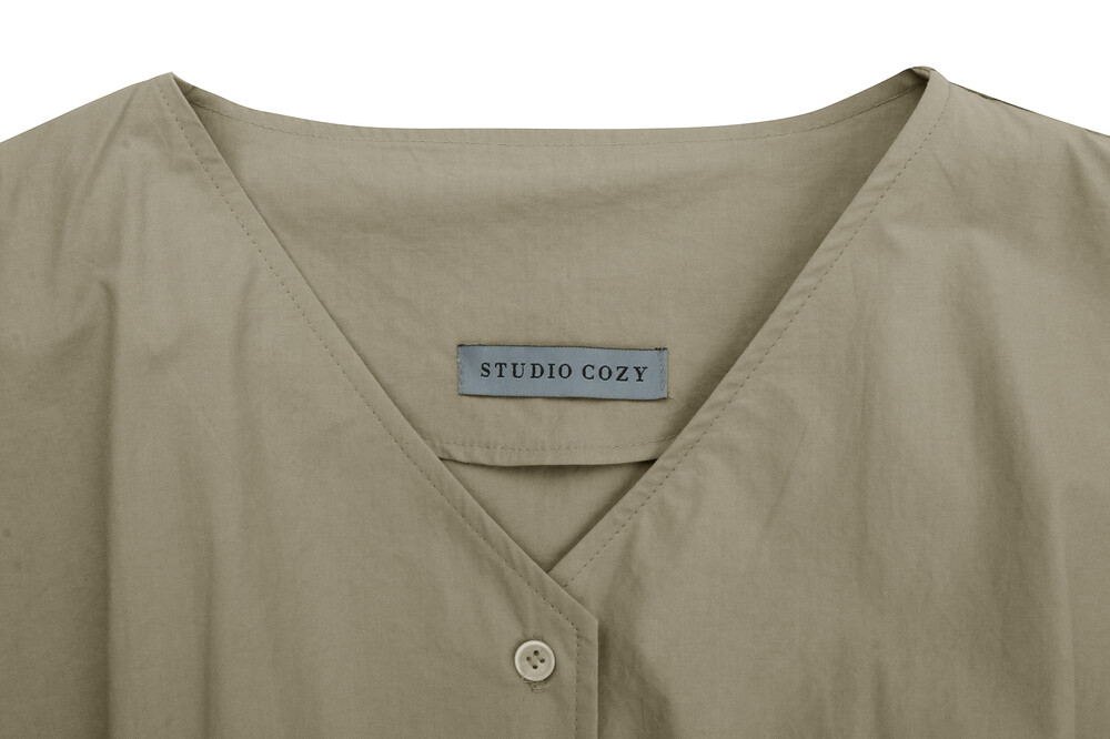 스튜디오코지의 브이넥 베이지 점프수트는 면 100% 원단을 사용하여 훌륭한 착용감을 선사합니다. 약간의 드롭 크로치로 점프수트지만 앉으나 서나 답답하지 않게 착용 가능하며 상체에는 약간의 볼륨을 주어 스튜디오코지만의 유니크함을