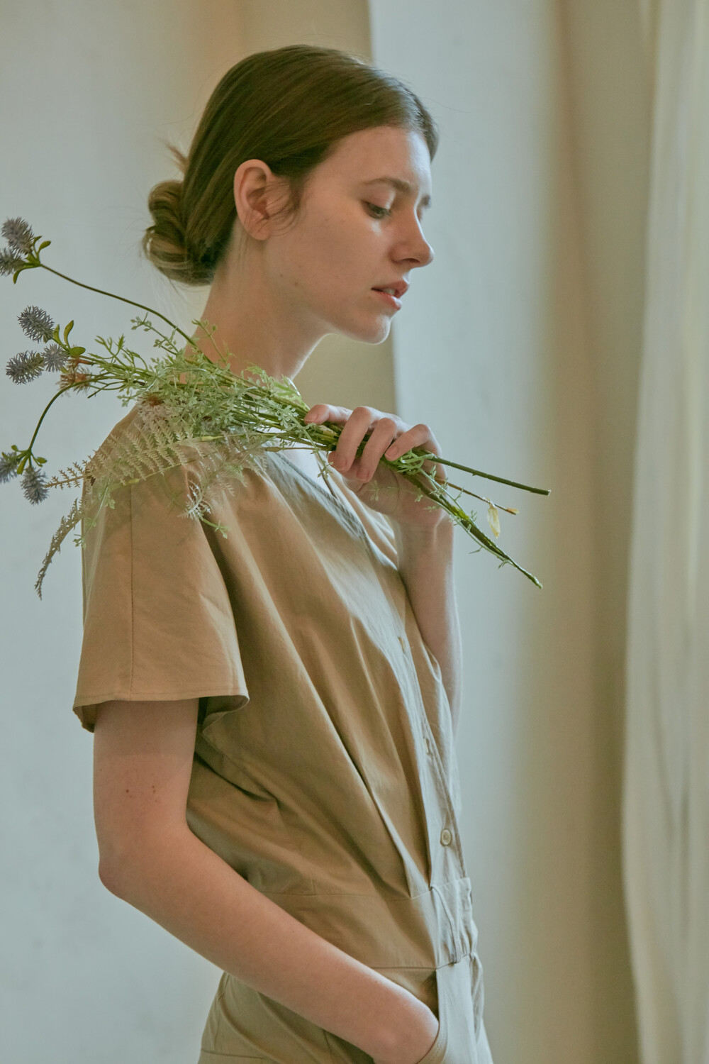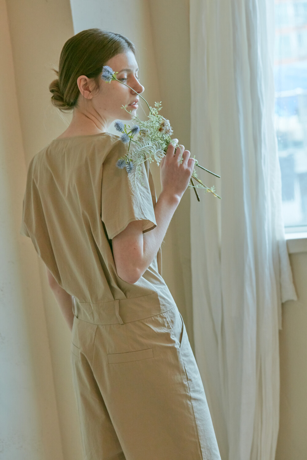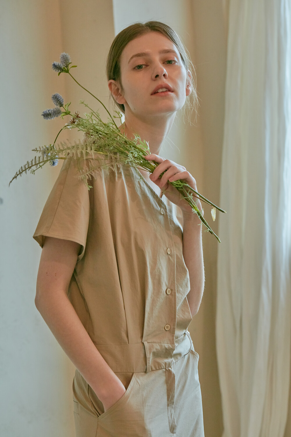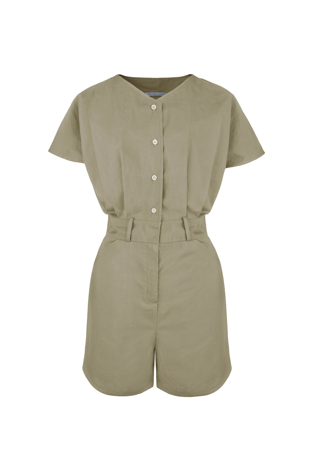 스튜디오코지의 브이넥 베이지 점프수트는 면 100% 원단을 사용하여 훌륭한 착용감을 선사합니다. 약간의 드롭 크로치로 점프수트지만 앉으나 서나 답답하지 않게 착용 가능하며 상체에는 약간의 볼륨을 주어 스튜디오코지만의 유니크함을