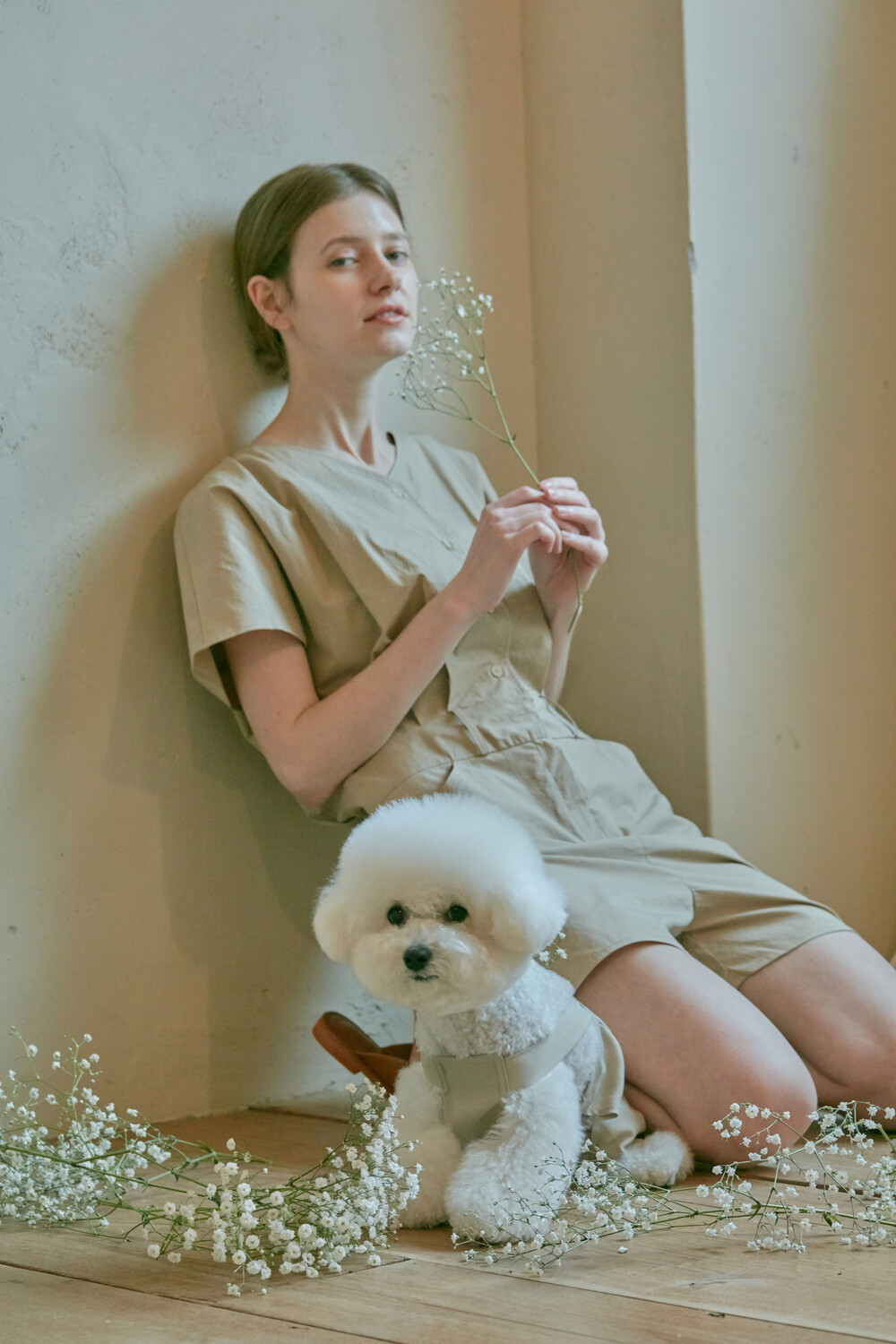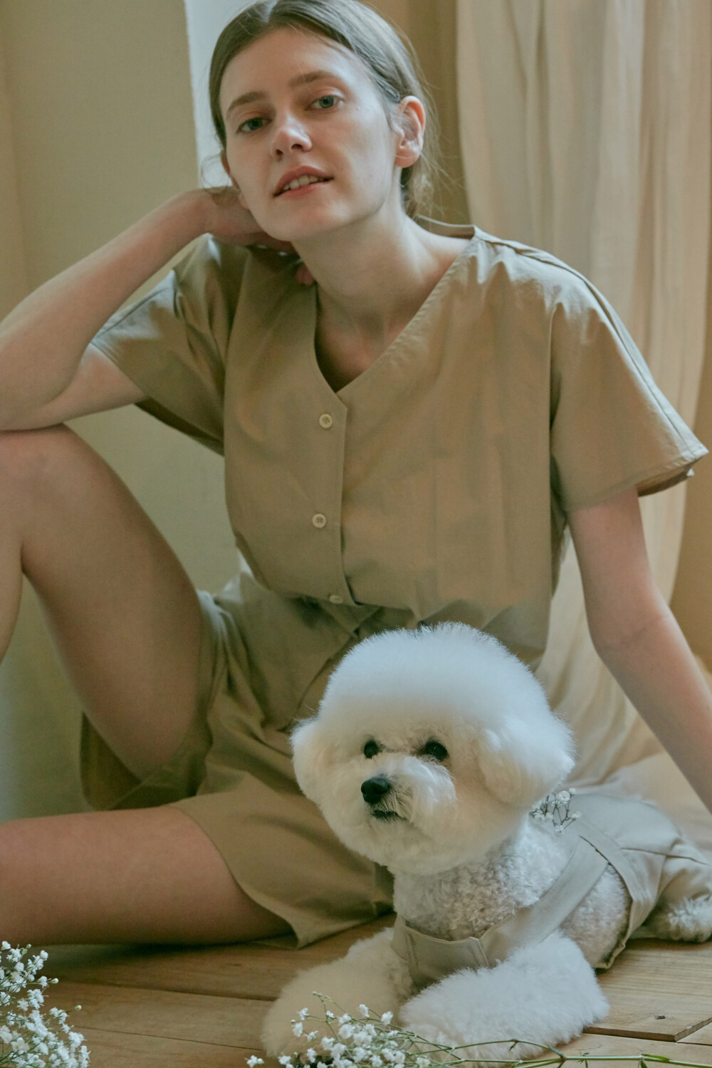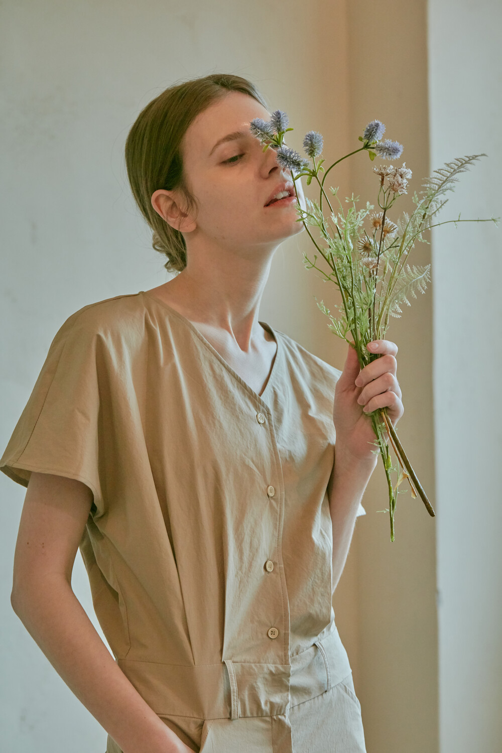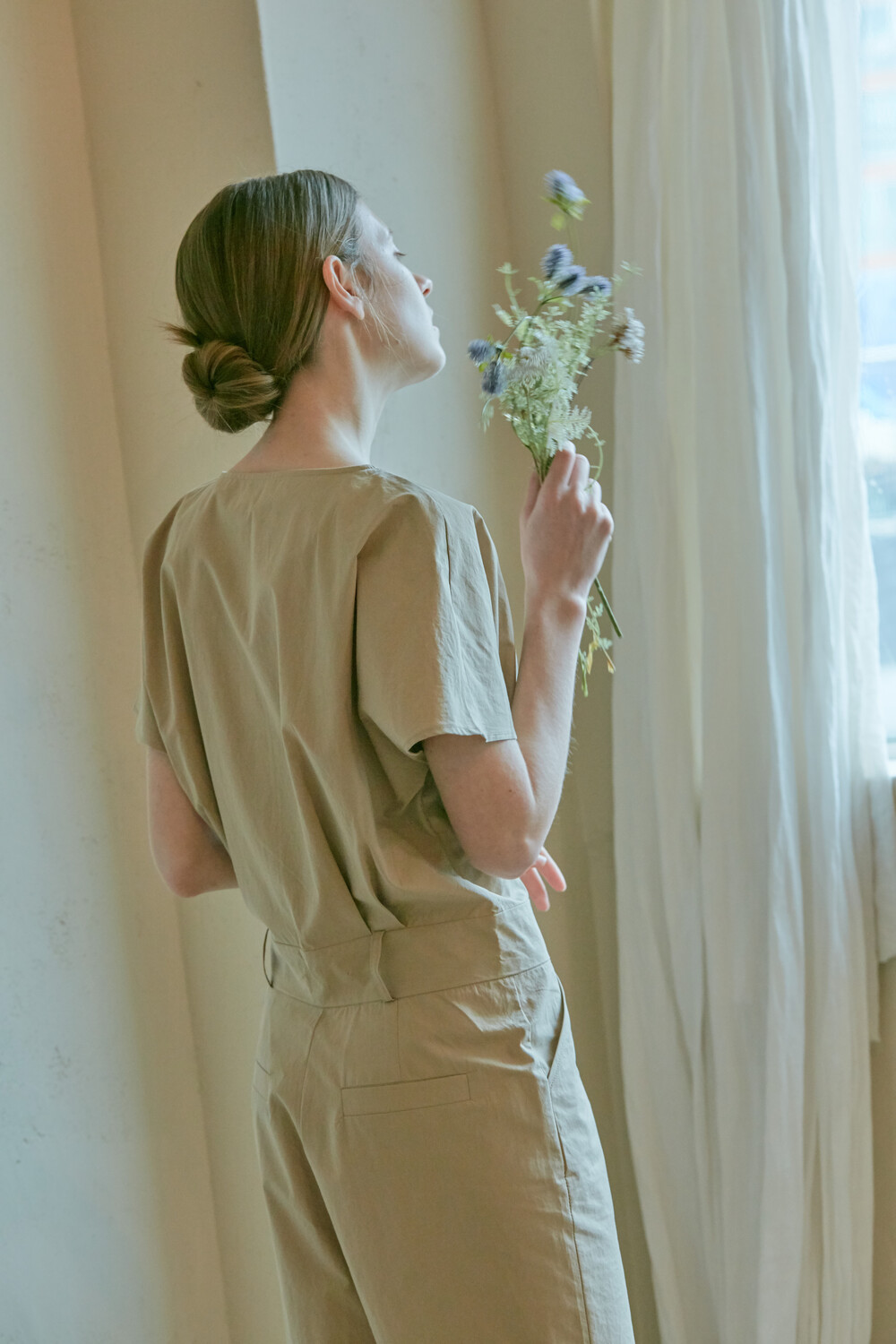 스튜디오코지의 브이넥 베이지 점프수트는 면 100% 원단을 사용하여 훌륭한 착용감을 선사합니다. 약간의 드롭 크로치로 점프수트지만 앉으나 서나 답답하지 않게 착용 가능하며 상체에는 약간의 볼륨을 주어 스튜디오코지만의 유니크함을